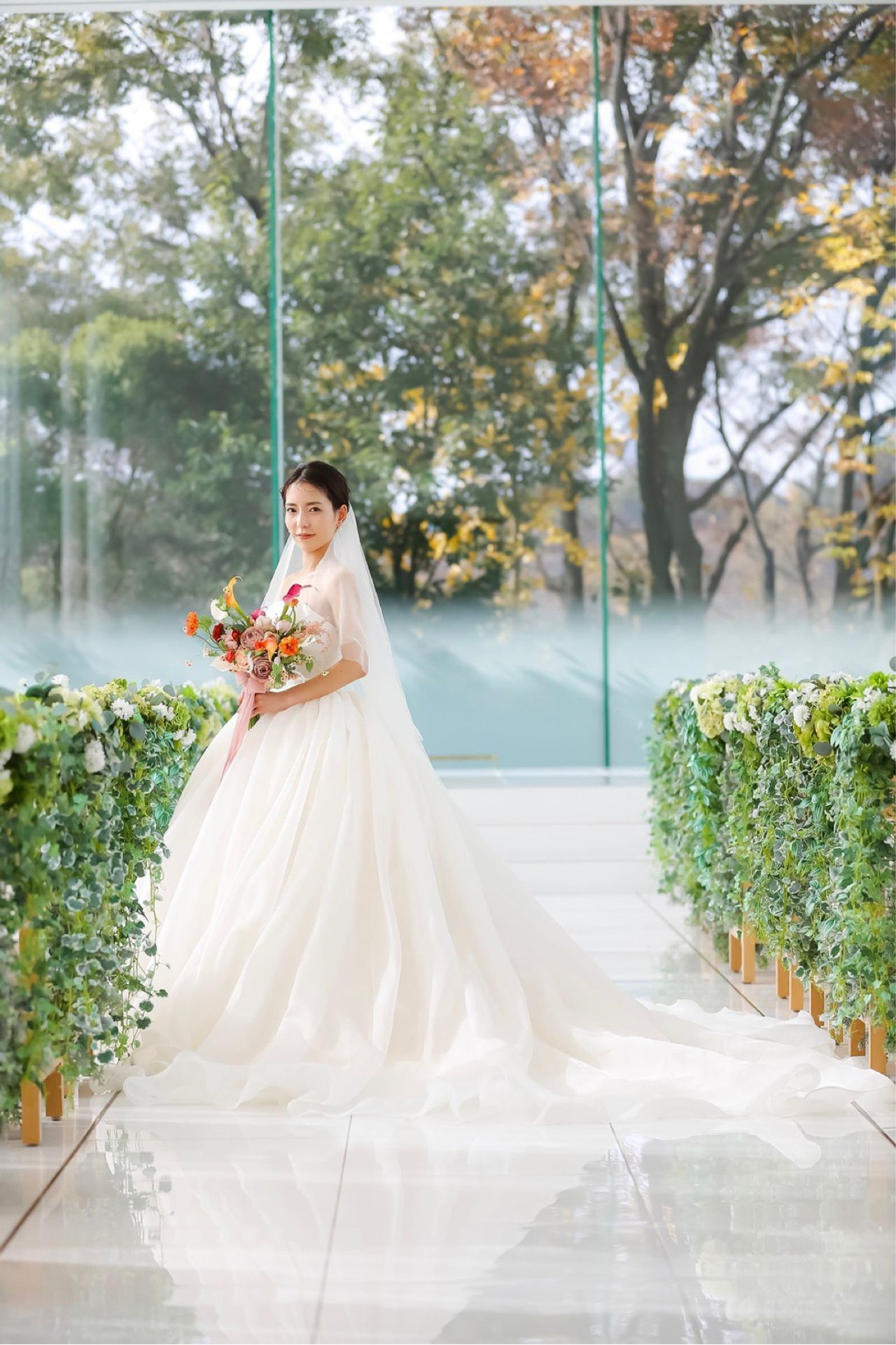 ガラス張りで温かい陽射しが差し込み、緑が多く自然豊かな雰囲気が最高です。また、チャペル内でムービーが上映できるのも決め手の一つでした。