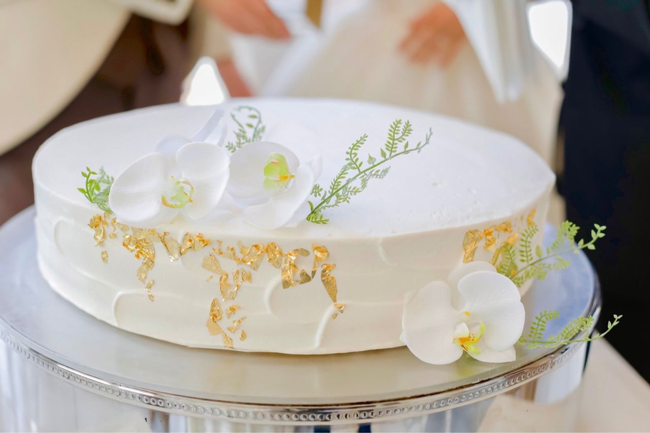 胡蝶蘭と金箔を使用した、一段のシンプルなデザインです。ウェディングケーキには特別こだわりがなかったので、コストを抑えられる範囲で選びました。