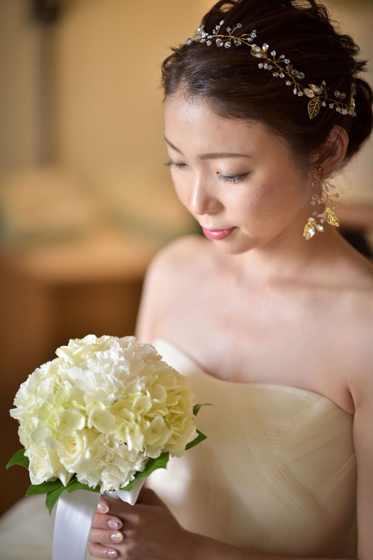挙式はけじめの意味を込めて少しカッチリ オールバックに。ヘッドアクセサリーをカチューシャ風にしたことでナチュラルだけど華やかになりました。