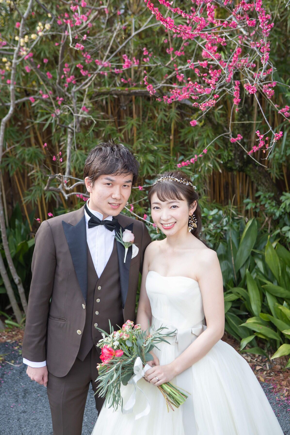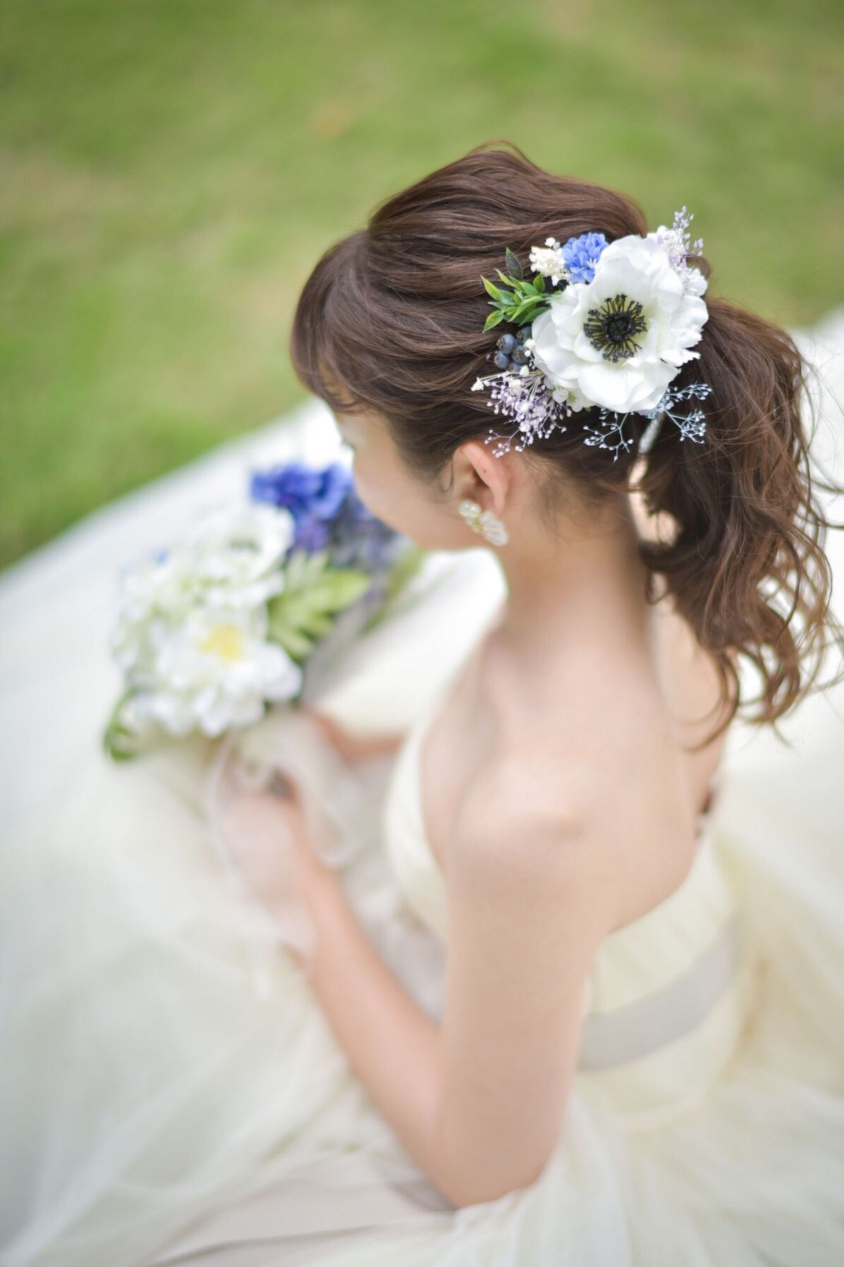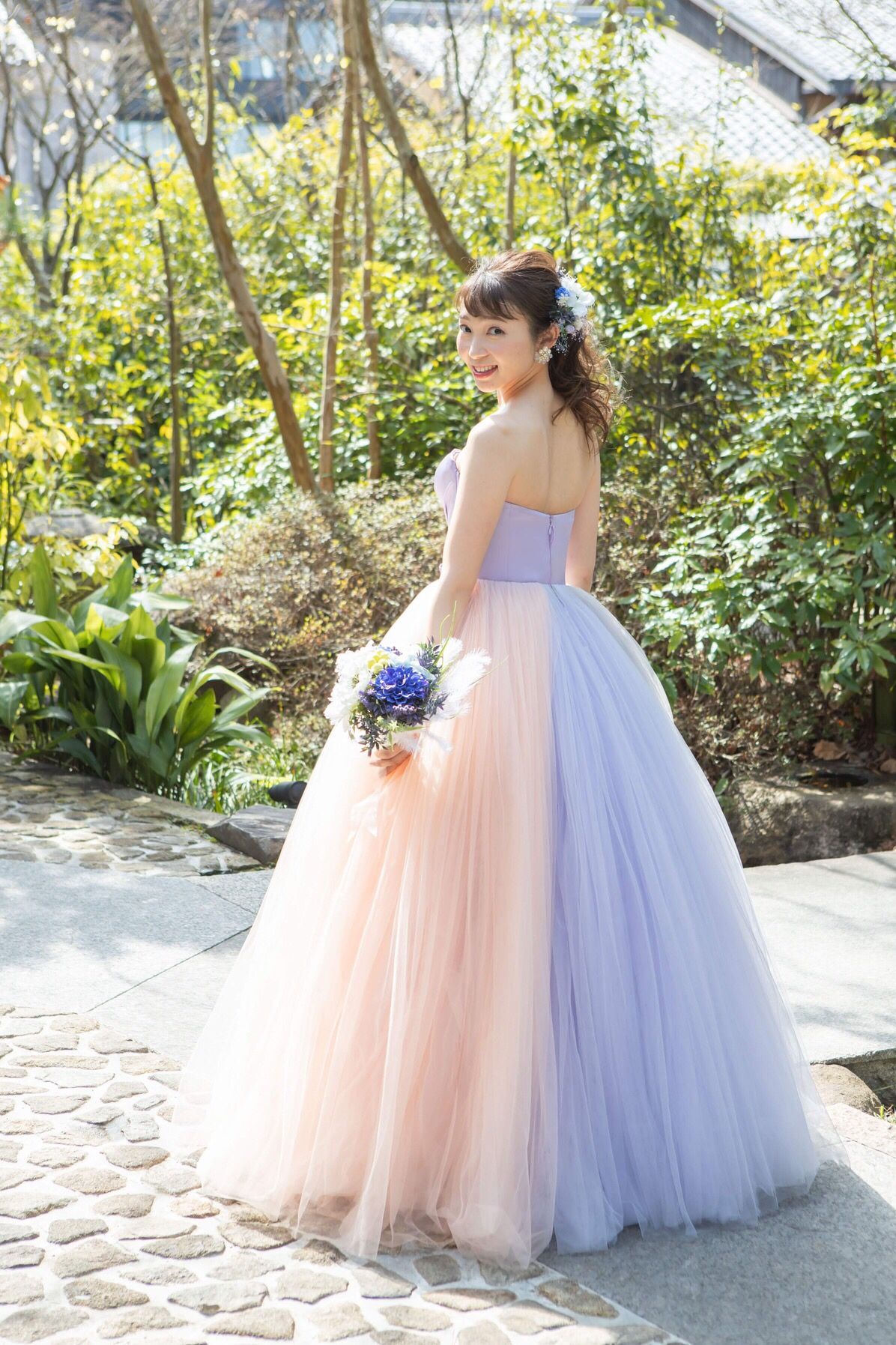 挙式後の撮影とカラードレスでは友人が手作りプレゼントしてくれたお花のヘッドピースとブーケに合わせてポニーに。元気な雰囲気になり私らしかったと思います。
