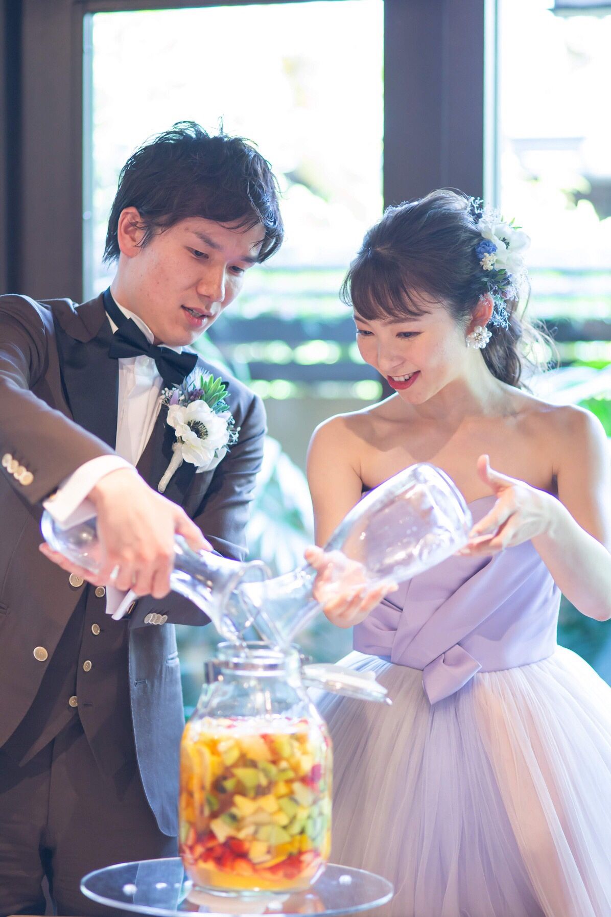 披露宴ではケーキカットの代わりにノンアルコールサングリア作りをしました。各テーブルにカットフルーツをご用意し、テーブルラウンドをしながら瓶にフルーツを入れてもらい最後に2人でジュースを注いで完成!食後のデザートブッフェでお召し上がりいただきました。