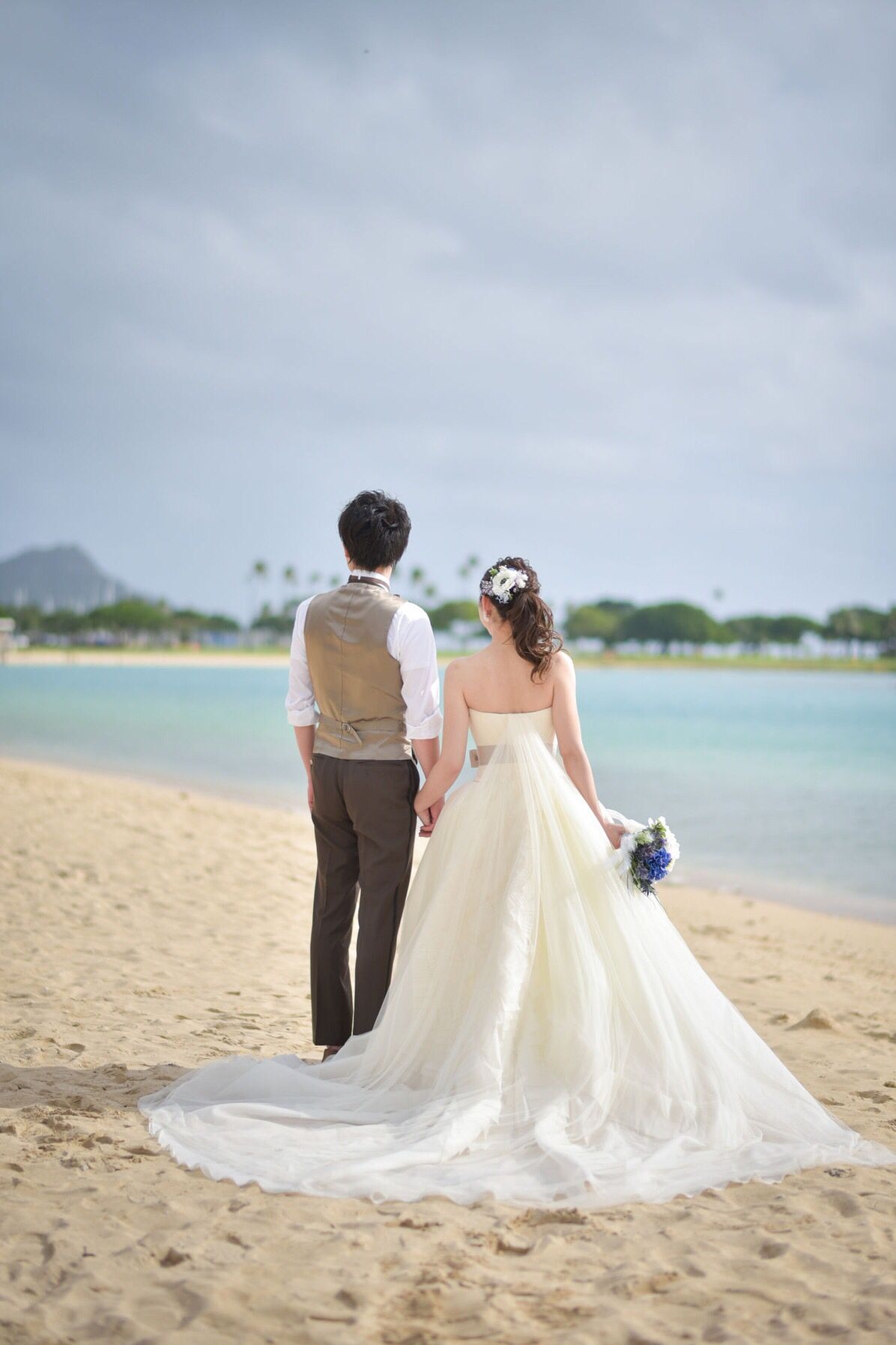 挙式会場のコンセプトであるナウパカが彫刻されたウッド調のチャペルの正面に、はダイヤモンドヘッドとオーシャンビューが見え、チャペルの扉が開いた瞬間の光景に鳥肌が立つほど感動しました。