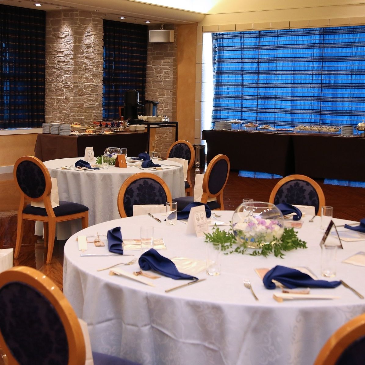 青を基調としており、テーマにピッタリの会場でした。乾杯の合図と同時にカーテンが開き、大きな窓から海の景色が広がるので、余興がなくてもインパクトのある演出になります!