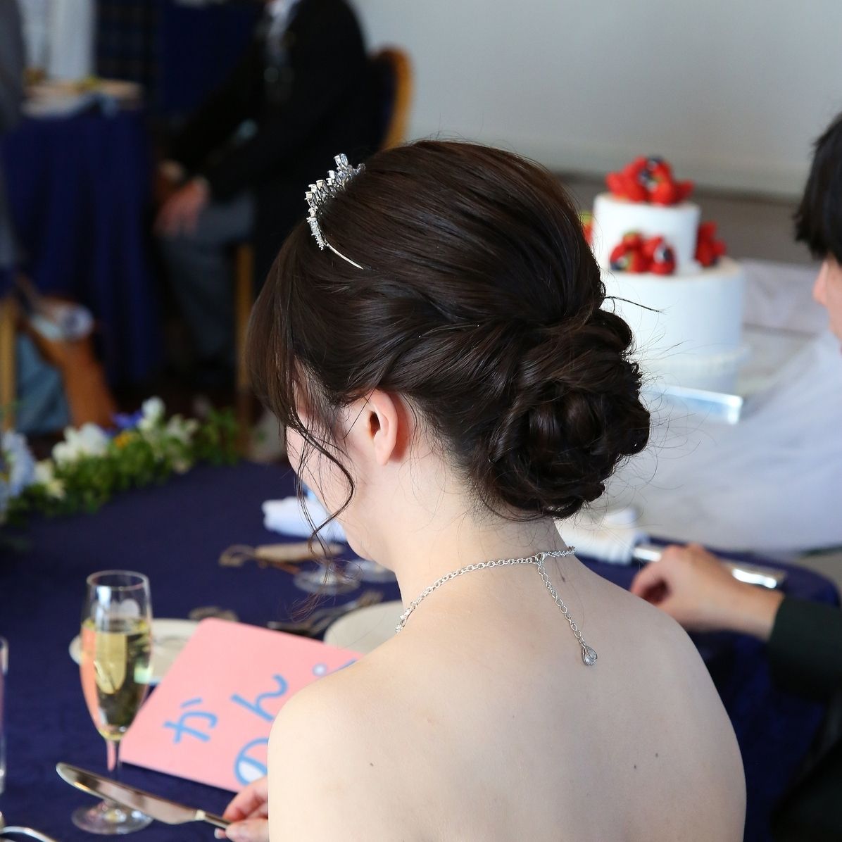 2部ではドレスは変えずにサッシュベルトをつけ、ヘアチェンジをすることで、少し雰囲気を変えています。