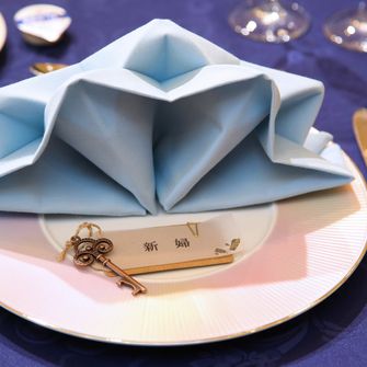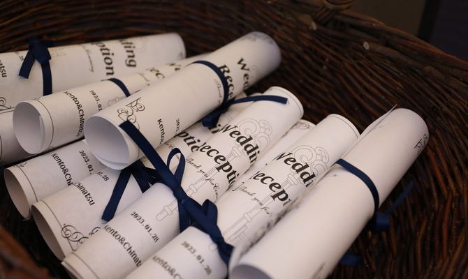 テーマの主張を強くしたくなかったため、ペーパーアイテムにほんのり要素を入れたり、ウェルカムスペースに小さいアイテムを置いて、よく見るとわかる!という感じにしています。
