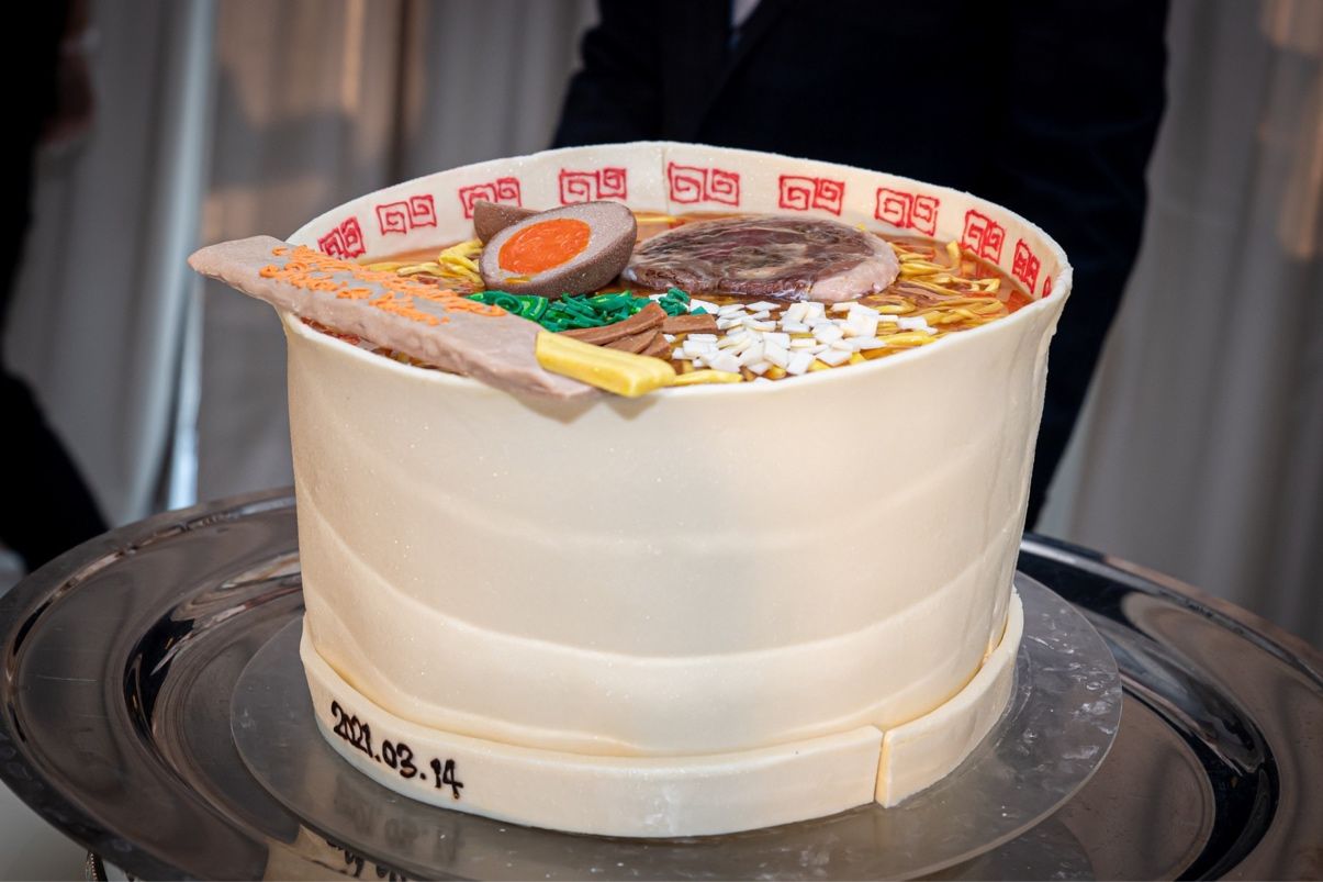 ラーメンをイメージしたケーキを、どんぶりごと作って貰いました。可愛いイラストのようなラーメンではなく、リアルを追求したものを生ケーキで表現して頂きました。