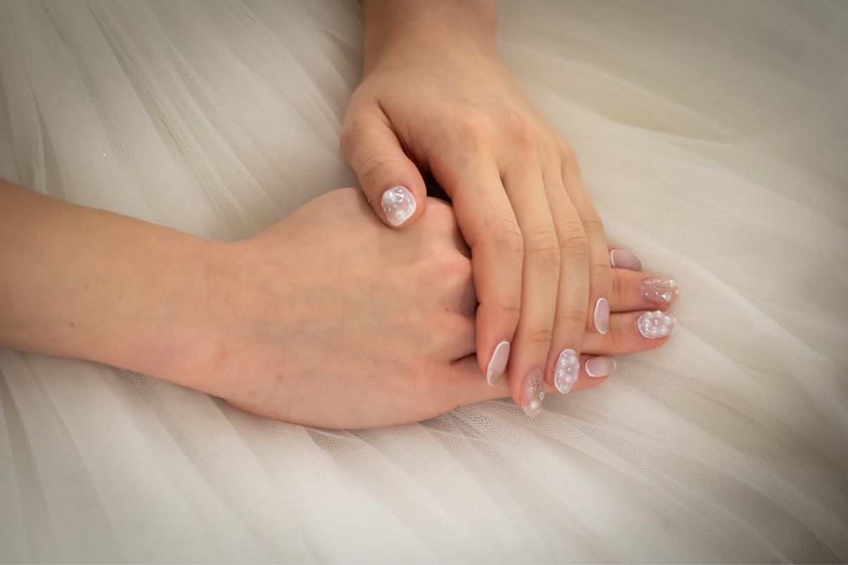 花嫁らしくホワイトを基調とし、指ごとに違うデザインにパールを添えて貰いました。スタッズも使い、遠目からでもデザイン性のあるネイルに見えるよう工夫しました。