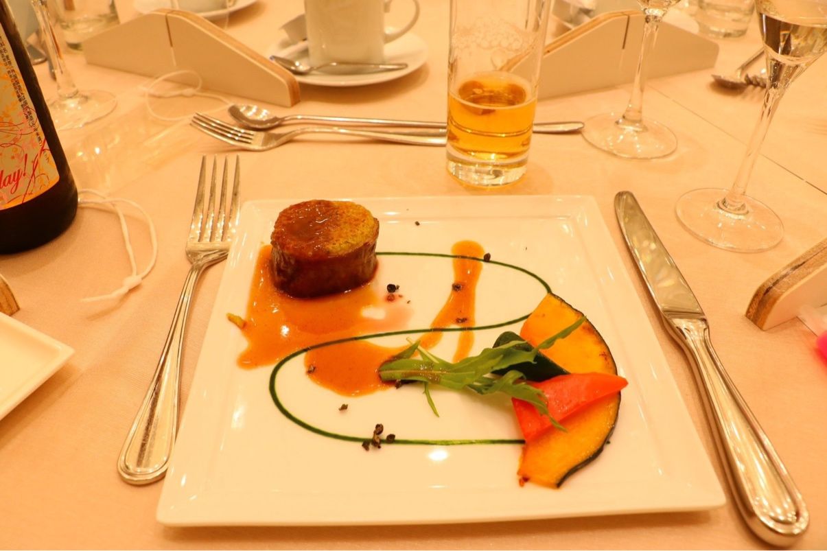 お肉のグレードを上げてスープを追加し、品数を増やしました。当たり前のことですが、温かいものは温かい内に、冷たいものは冷たい内に出してもらえるようプランナーさんからシェフに伝えて貰いました。(笑)その甲斐あってか、親族から「今までの結婚式で1番美味しかった」と好評でした!