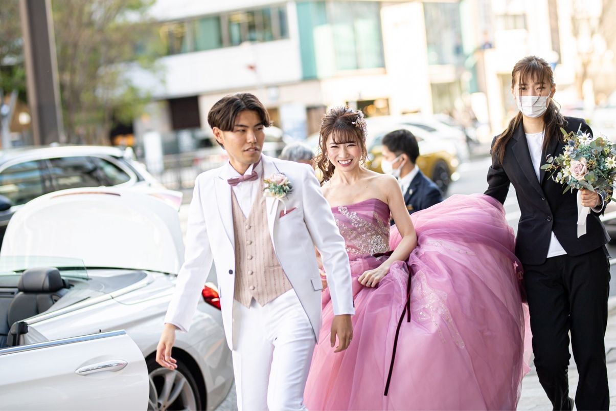 式場提携のドレスショップで選んだセラマジィのドレスです。大人っぽいくすみピンクのカラードレスを探していたところに出会いました!動きやすいドレスでボリュームも丁度良く、何色ものピンクが使われていて、見る角度によって少しずつ雰囲気が変わるのが素敵でした。
