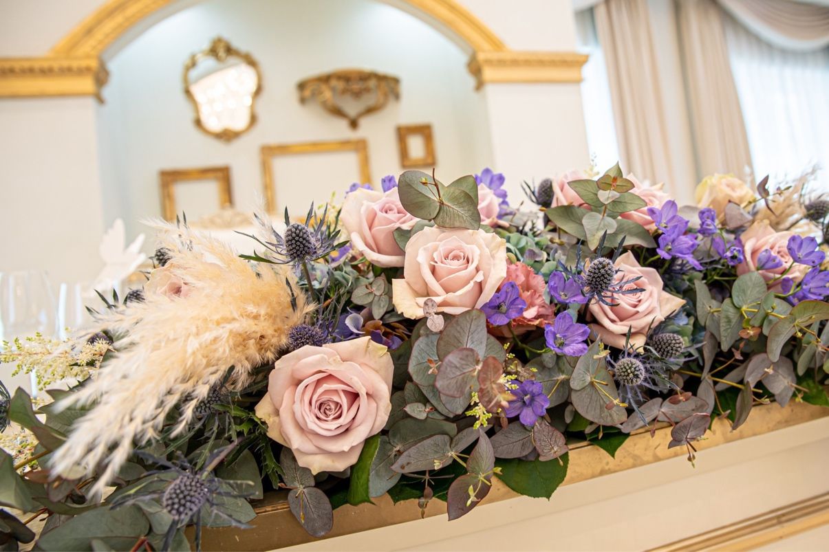 薔薇や紫陽花を使いましたが、強めの印象にならないよう全てくすみカラーで統一しました。名前がゆかりなので、ユーカリの葉を多めに入れて貰いました。