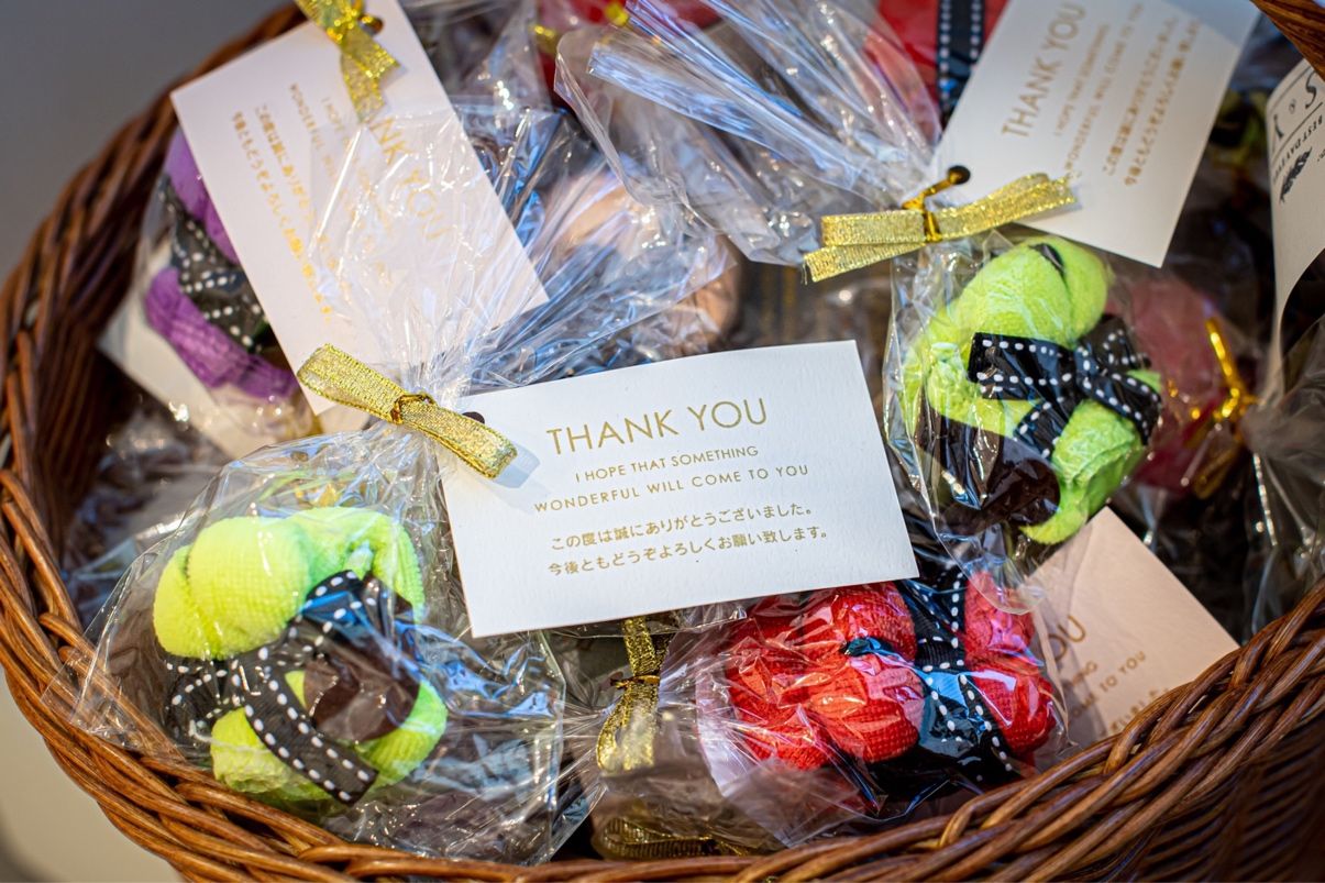 愛犬がいるのでその要素をどこかに取り入れたくて、犬型に畳まれたハンドタオルを贈りました。手作りのサンキュータグを付けました。