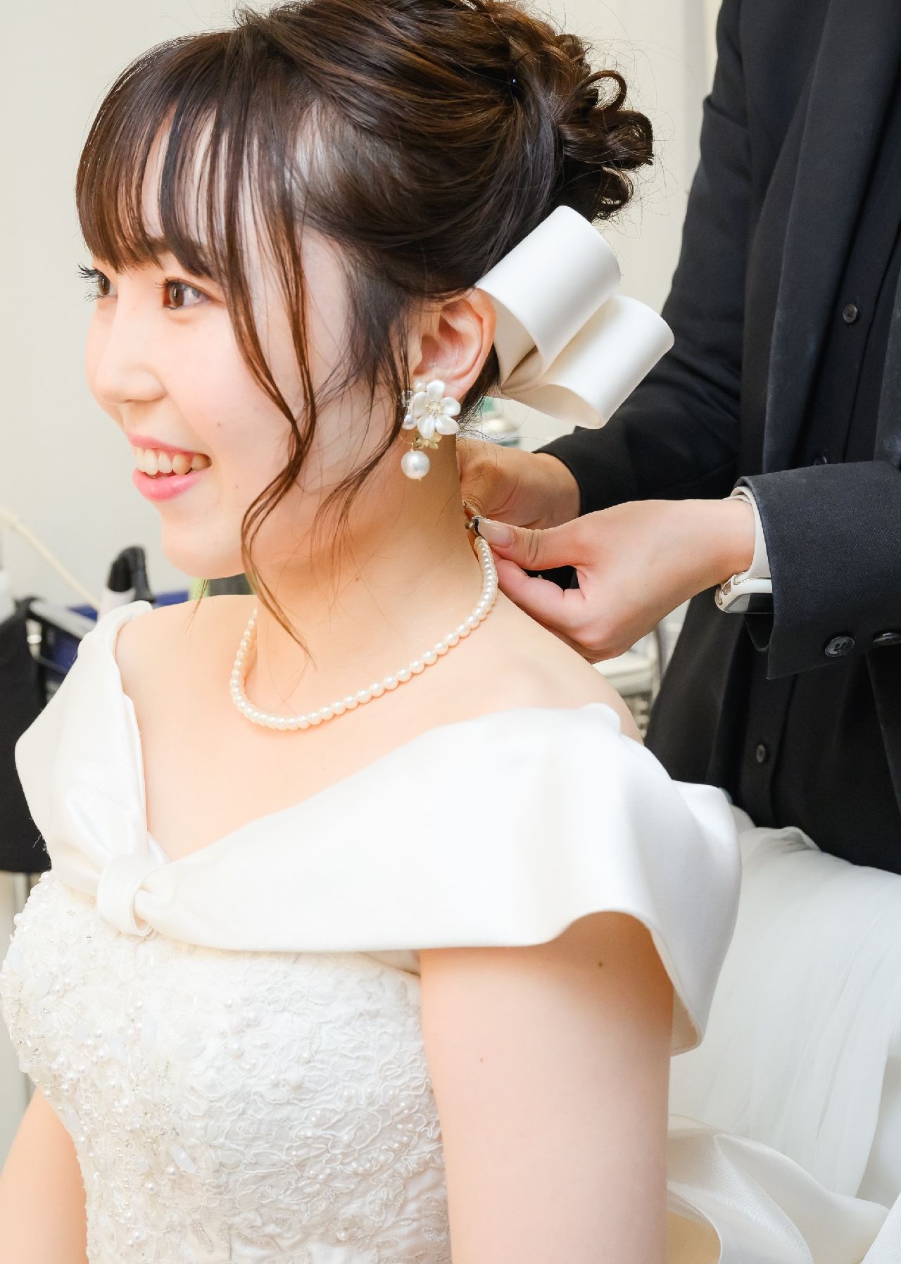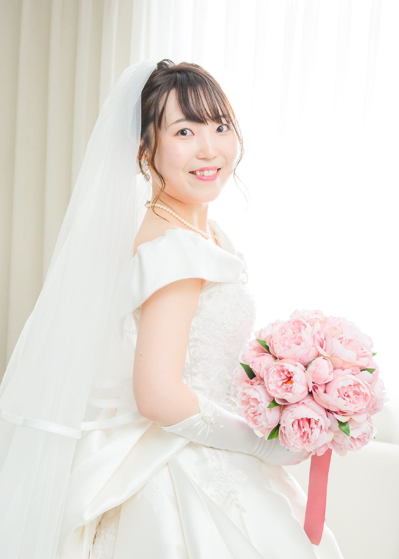 挙式ではリボンボンネ、グローブ、パールイヤリング、パールネックレスを使用しました。