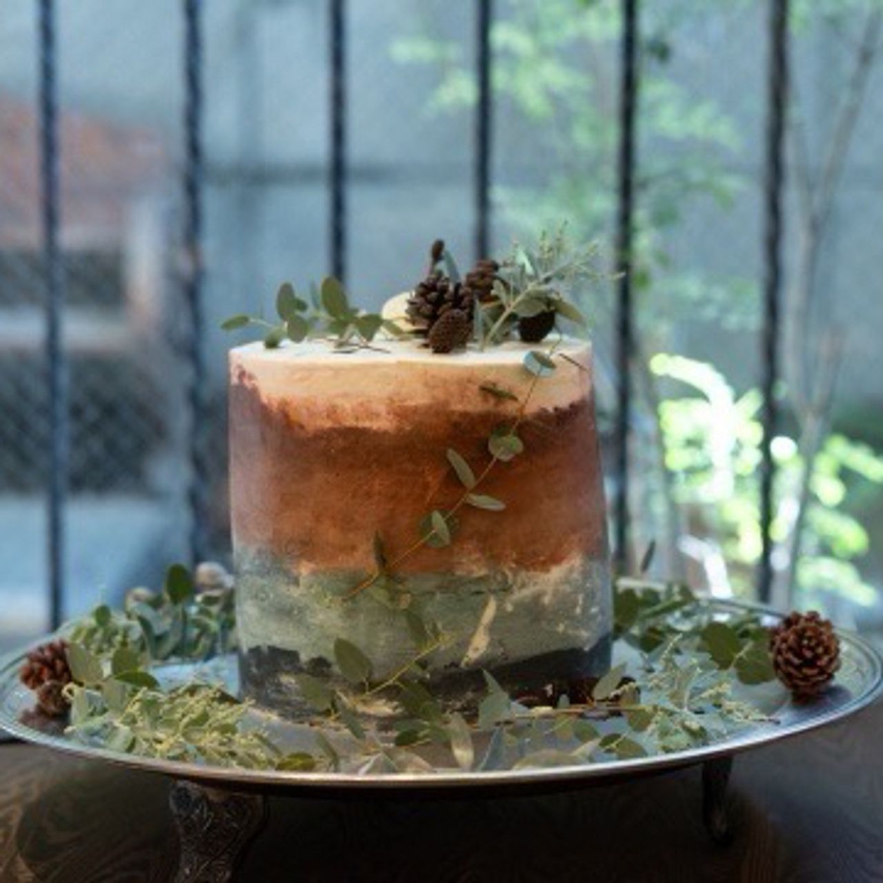 側面のクリームの色をくすんだグリーン・ブラウンにして、クリームの塗り方や装花でアレンジしました。