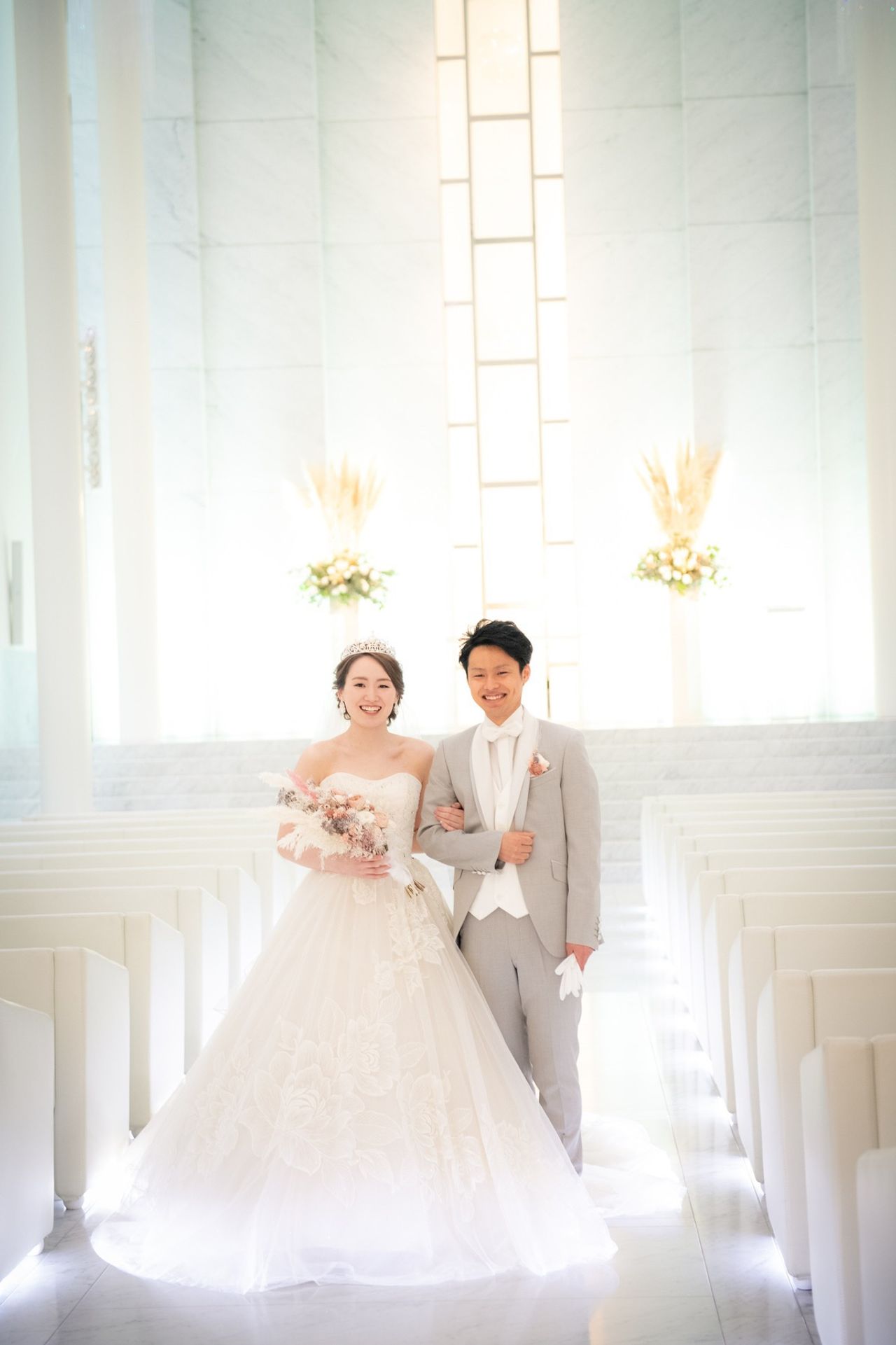 天井の高さ、階段の高さ、真っ白の大理石のチャペルには圧倒されます。階段の高さがあることによって、ドレスの裾まできれいに見えること、ゲストの顔が後ろの席の方まで見えることがとてもよかったです。真っ白な会場なので写真映えもしました。