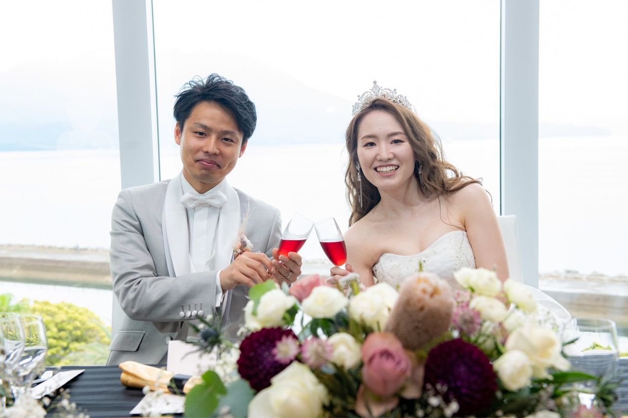 スタイリッシュな会場の雰囲気と、階段入場ができること、高砂後ろのカーテンを開けると桜島がきれいに見える絶景が決め手です。画面スクリーンも魅力的でした。