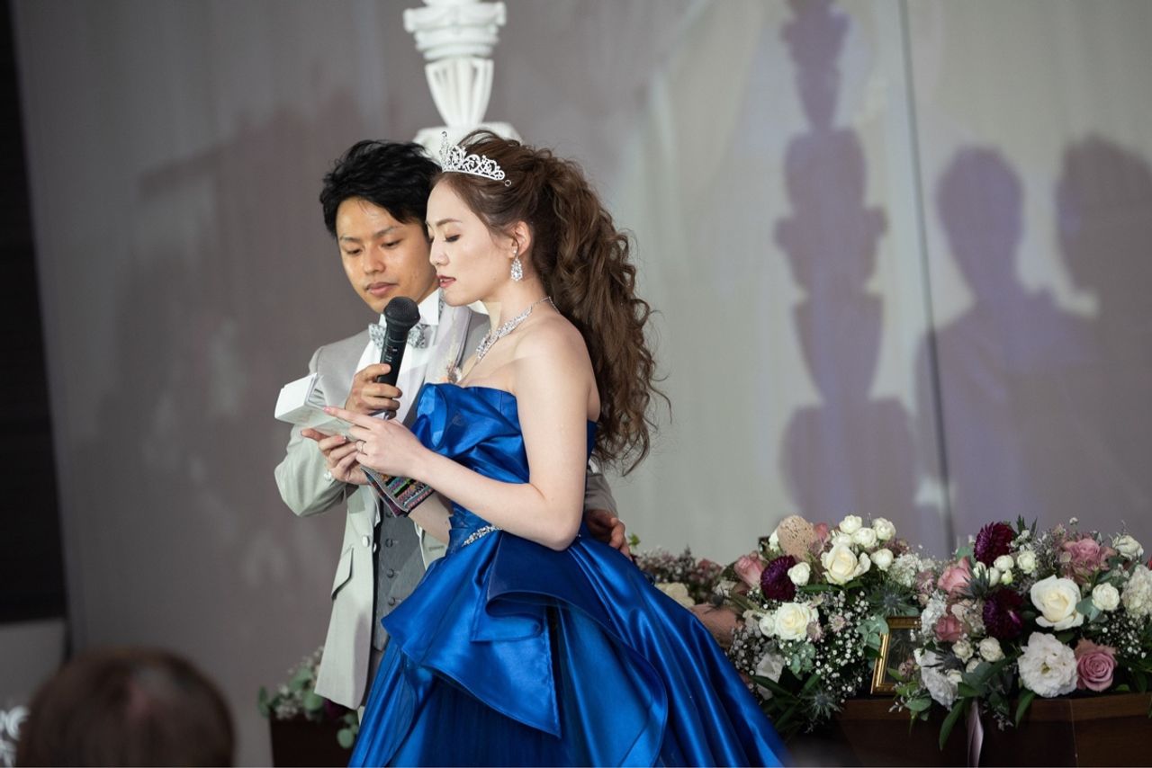 小さい頃からブルーが好きで、ブルーのドレスを着たいと思っていました。中でも濃いブルーの顔映りが一番よく、腰にビジューが少しついているのもキラキラ豪華な感じがして気に入りました。