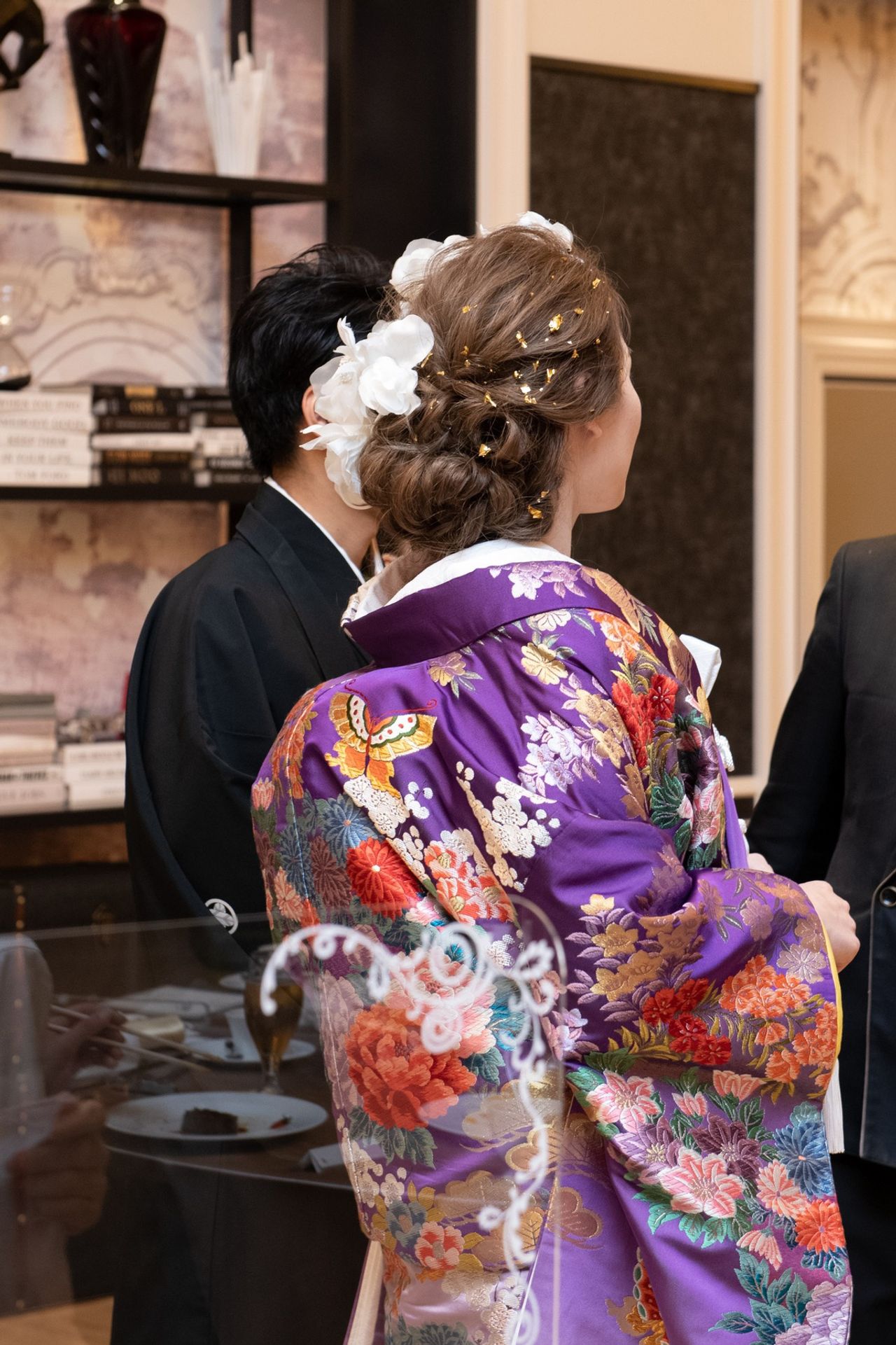 和装入場:とにかくインパクトのあるヘアアクセサリーをつけたくて決定しました。また、和装にゴールドが入っていたので、ヘアにも金箔を付けました。