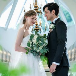 【憧れドレス試着&贅沢牛フィレ試食付】自然光射し込む白基調のチャペルで、階段からの入場シーンやフラワーシャワーなど記憶に残るセレモニーを体験。聖歌隊の歌声響く、光と緑、開放感溢れる空間を体感して。