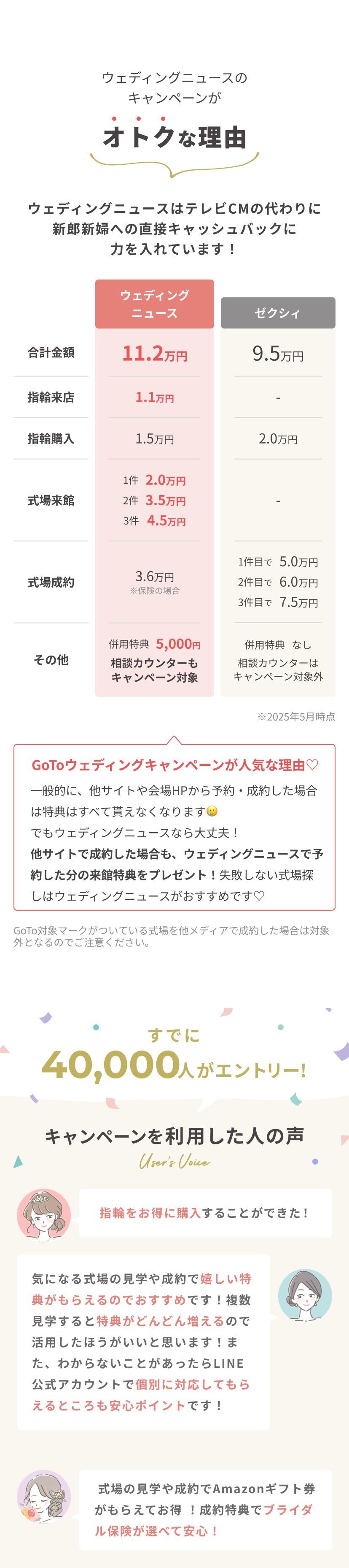 ・ウェディングニュースでキャンペーン対象として掲載している結婚式場を、他社媒体を経由してご成約された場合は本キャンペーンの対象外となります。