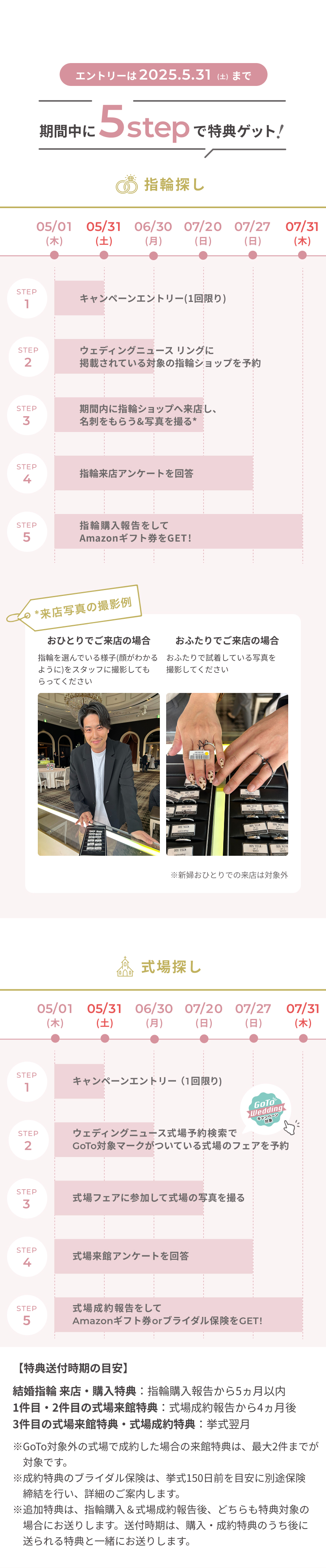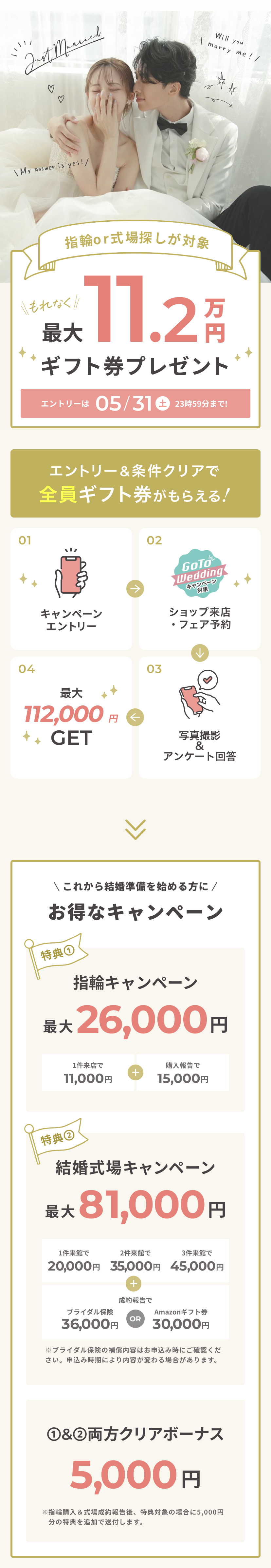 ・婚約/結婚指輪や結婚式場を決めることを応援する企画であり、指輪ショップや結婚式場が指輪や結婚式場を探す意思がないと判断した場合、本キャンペーンの対象外となります。