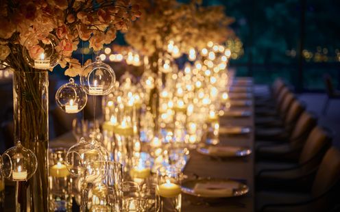 黒と白を基調にラグジュアリーなインテリアがアクセントになっている上質空間。テーブルスタイリング次第で様々な雰囲気を演出することが可能でグリーンをあしらい、ナチュラルな雰囲気にも創り上げられます。また、2つのパーティ会場には340インチの巨大スクリーンを完備。最新のマルチプロジェクションシステムを駆使して会場内各所のリアルタイムなシーンをはじめ、ゲストの表情を映し出すことも可能です。