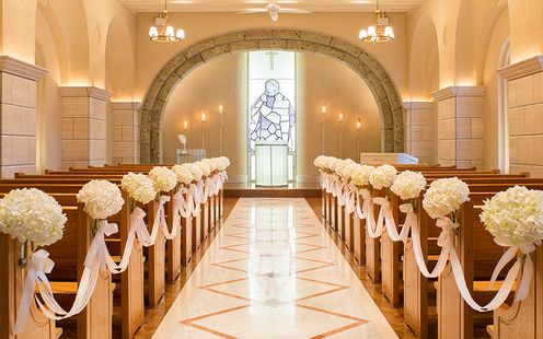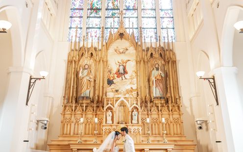 140年の歴史のあるステンドグラスから降り注ぐ太陽の光に包まれる神聖な空間で感動挙式を