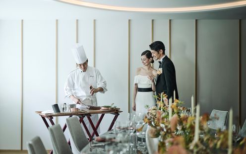 長野県産の食材をふんだんに使用し、さらに全国・海外から厳選した素材をも活かしたスタイリッシュなフレンチがふたりの祝宴のテーブルを華やかに彩ります。会場隣接のキッチンから出来立ての料理をおもてなしいたします。