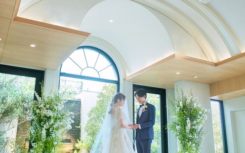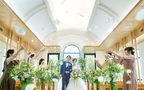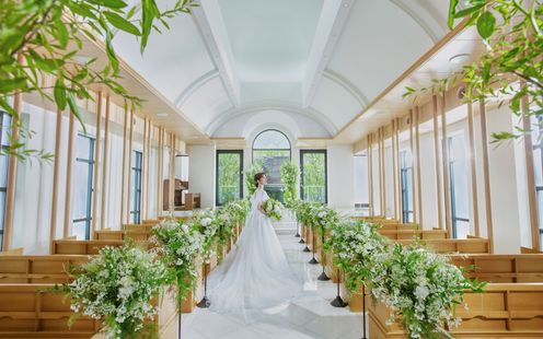 光と水と緑の祝福を受ける白を基調としたチャペル。優しい自然光が差し込み、花嫁のドレス姿をより美しく引き立てます。明るく開放的な空間で、大切なゲストに見守られながらお式をお迎えください。