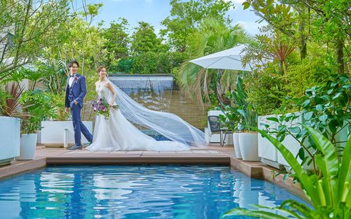 ウェディングコートエミリア内には、様々なタイプのガーデンがあります。会場に併設したプール付きガーデンは、駅前とは思えないほど開放的な空間。ここではゲストと一緒にビュッフェ演出や写真撮影が楽しめます。神殿と併設した緑豊かな日本庭園は、和装での撮影にピッタリ。日常を忘れる空間で、ゲストと思い思いの時間をお過ごしください。