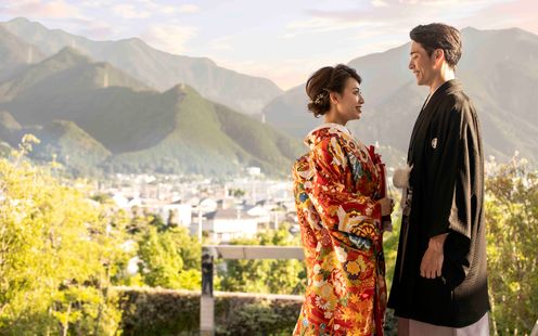 木のぬくもりと自然光に包まれるナチュラルで洗練された空間です。ゲストとの距離が近く、一体感を感じられるレイアウトも魅力。シェフが目の前で仕上げる出来立ての料理を楽しんでもらえるのも好評です。どんなテイストも似合う雰囲気でドレス姿だけでなく和装もおすすめ。滝の流れる庭園での記念撮影はいかがでしょう。
