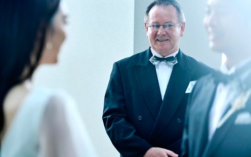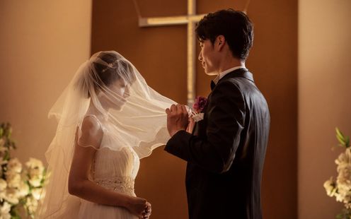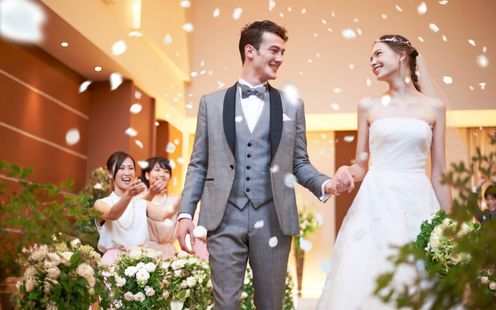 大聖堂でありながら、華やかさだけでなく大人でスタイリッシュな雰囲気を併せ持つ空間では落ち着きのある挙式も叶います。一段高いバージンロードを歩むふたりの姿や、一生に一度の誓いをゲストの皆様に大切に見届けていただけるのが特徴です。誓いの前にふたりの感謝を伝えるチャペルムービーを上映するのも好評です。