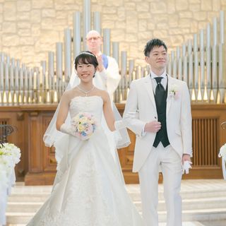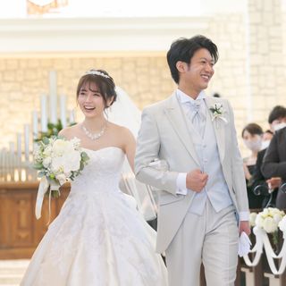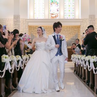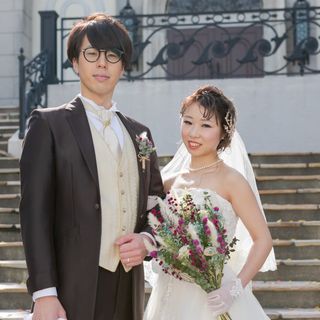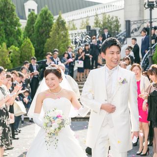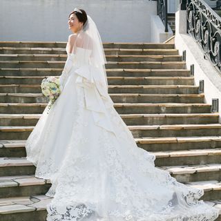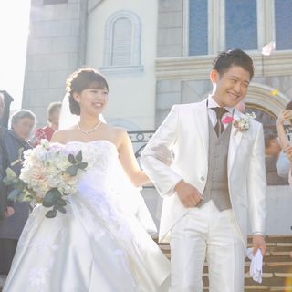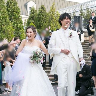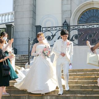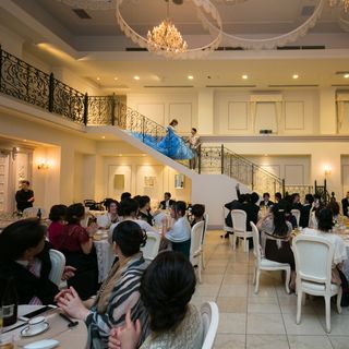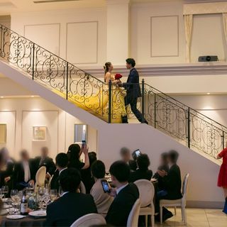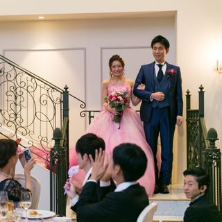 ガーデン付きの一軒家を貸し切った特別感溢れる会場。白を基調とした会場なのでカラードレスに合わせてコーディネートもしやすく、また大階段を降りる憧れの演出もできました。
