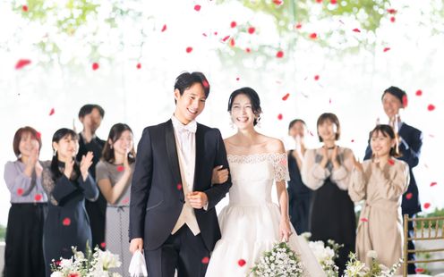 入口に広がる美しいガーデンは、前撮りスポットとしても人気のロケーション。自然光のもと、心温まる写真や演出ムービーの撮影が叶います。晴れの日には、ゲストからの祝福をガーデンで受けることも可能。開放感あふれる空間で、大切な方々と特別なひとときをお過ごしください。