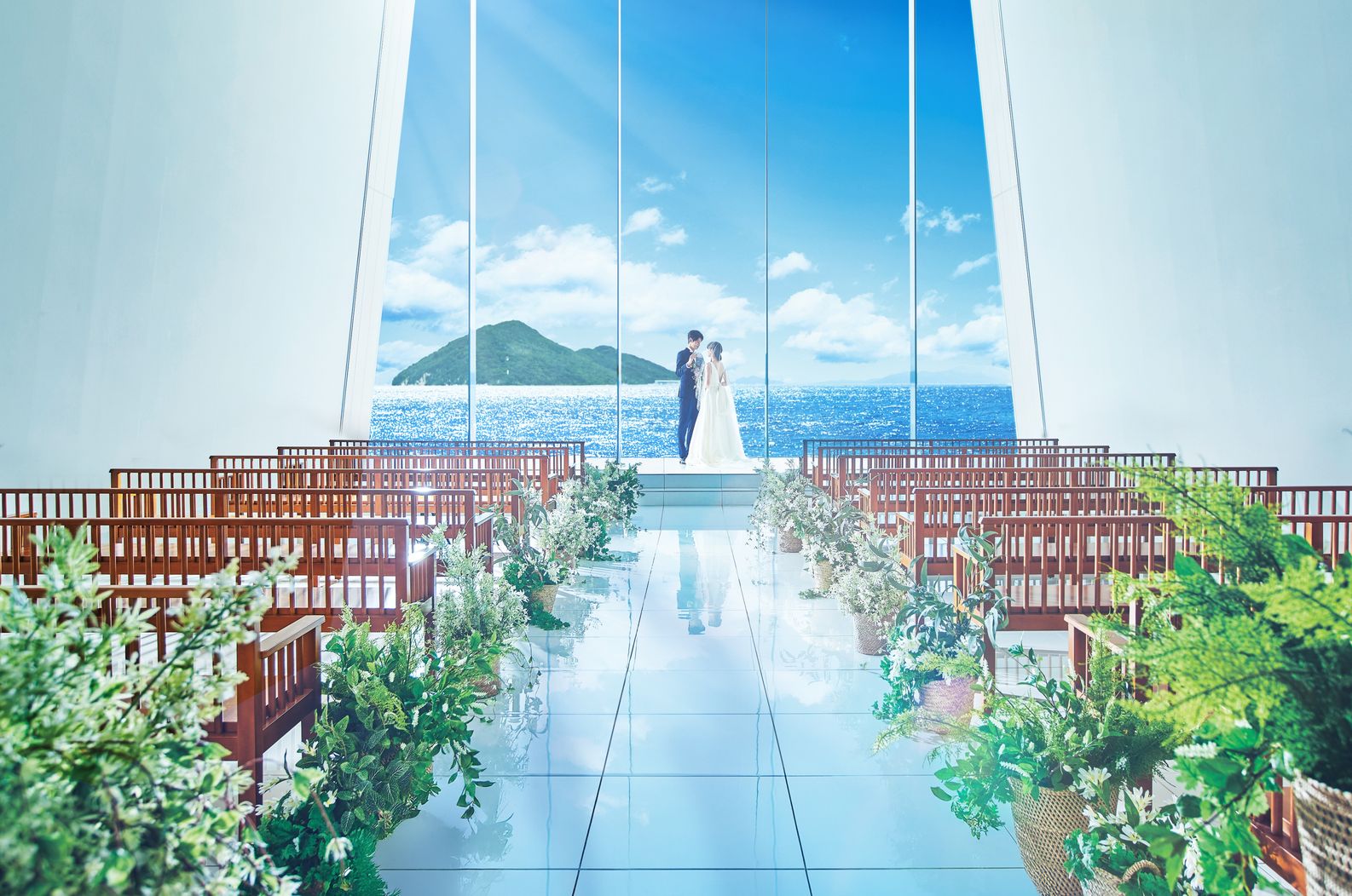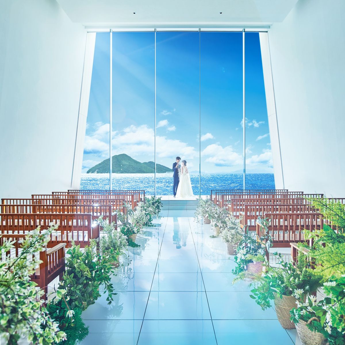 新郎新婦の背景はすべてガラスで一面に海が見え、とても開放的です。夕方から夜にかけてのお式だったので、自然に背景が変わっていき、幻想的な夕焼けも見れて美しかったです。