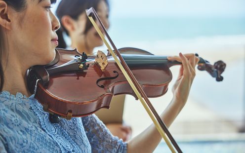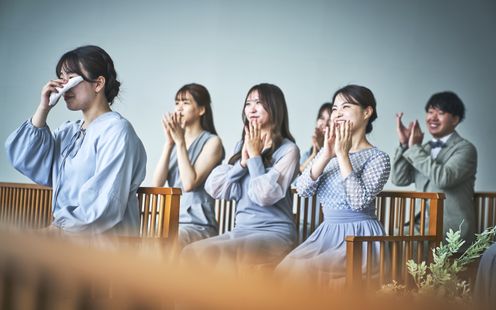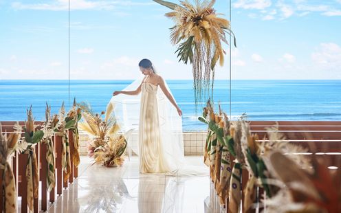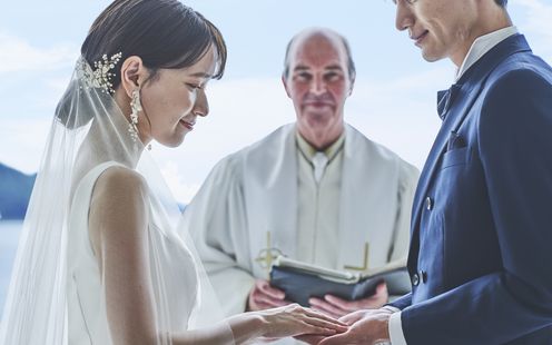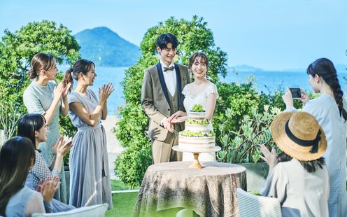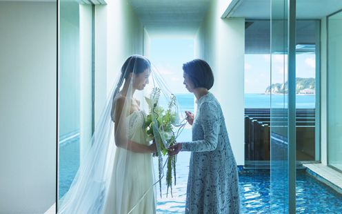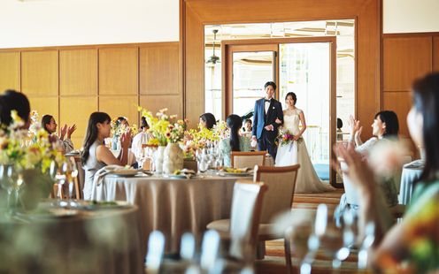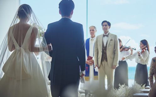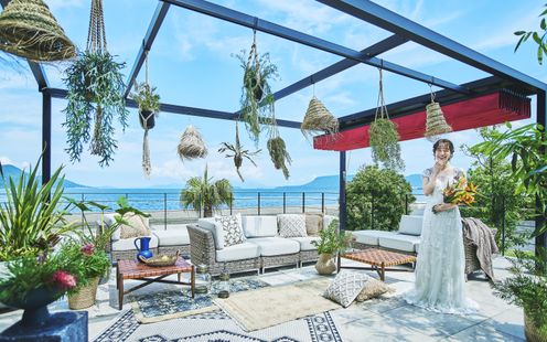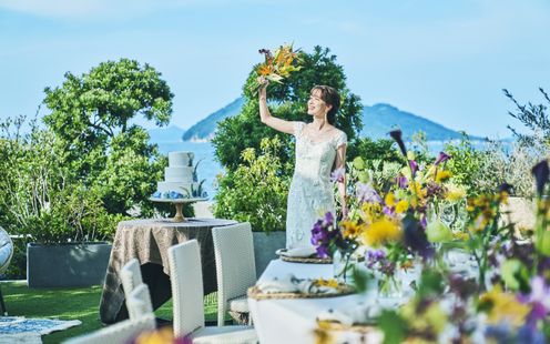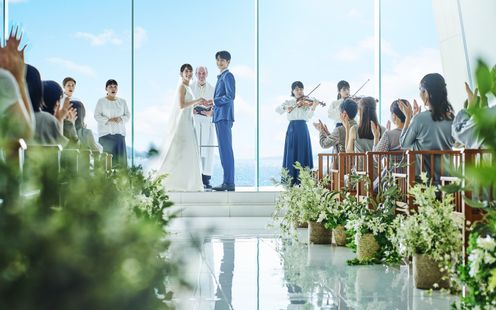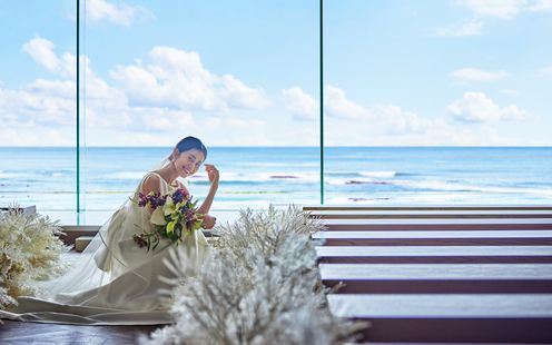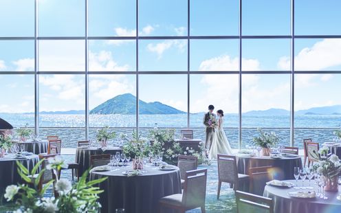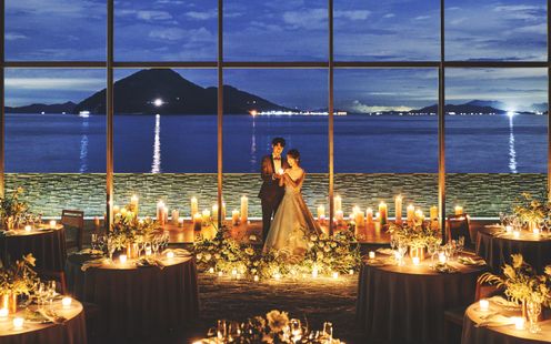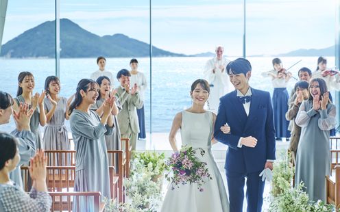 目の前に広がる美しい海と瀬戸内の島々、そしてたっぷりの自然光がおふたりを祝福する透明感溢れるチャペル。水平線へまっすぐ歩いていくようにバージンロードを進む花嫁の姿は、ゲストの記憶に美しく刻まれることでしょう。※着席100名まで