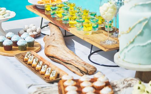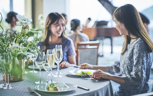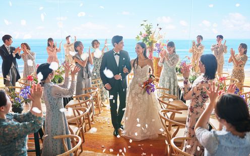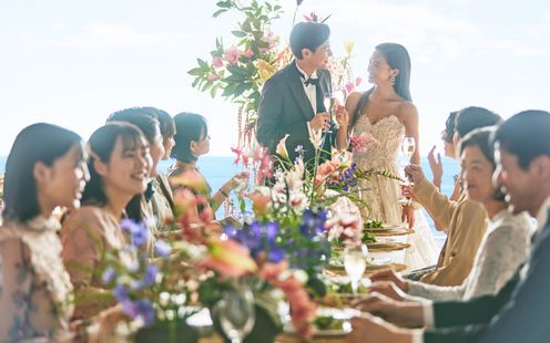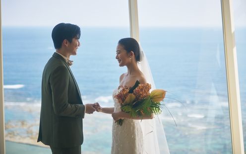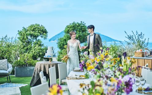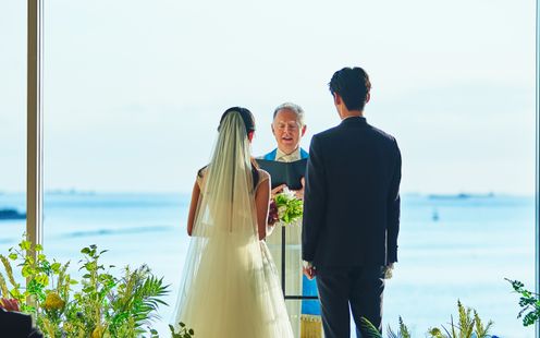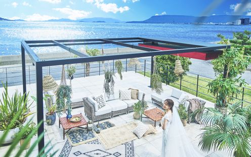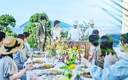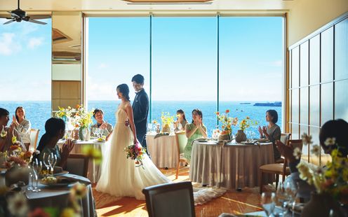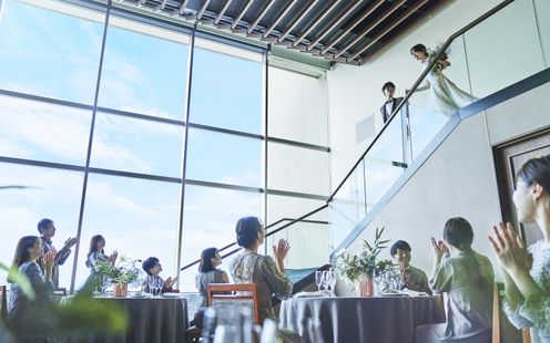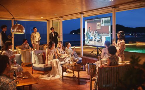 大きな窓から望む壮大なロケーションが訪れたゲストを魅了。シンプルモダンなデザインが映える会場は、まるで海へと溶け込むような感覚に。時の移ろいと共に表情を変える景色も美しい記憶に刻まれることでしょう。パーティスペースに併設されたテラスでは、潮風を感じながらデザートタイムを楽しんで。階段入場や窓越しのサプライズ入場、オープンキッチンを使用した演出など、パーティを彩る多彩なシーンにも注目です。