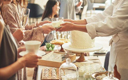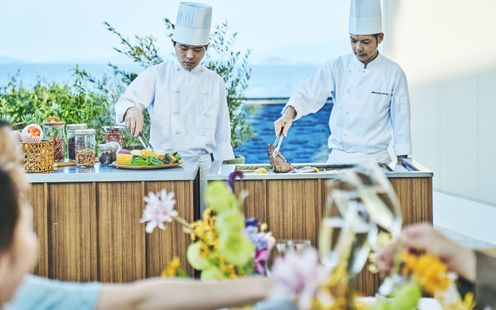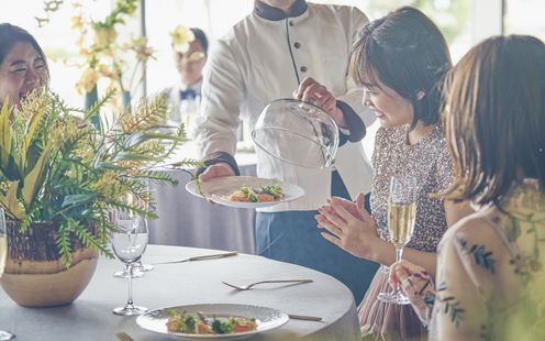 結婚式という特別な舞台で提供する料理は、瀬戸内海の魚介をはじめ、厳選した素材からつくる地産地消のおもてなしへとこだわっています。また幅広い年代の皆様に安心してお召し上がりいただけるよう、和洋折衷でアレンジしたり、皆様の目の前で焼き上げるメインディッシュや寿司ビュッフェなど、おいしい演出もご提案。ビジュアルのインパクトも大切にし、デザイナーとコラボした美しい一皿に仕上げました。全てはお客様の美味しい『笑顔』を拝見するために。