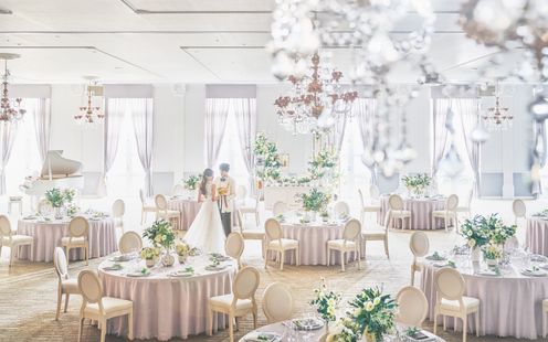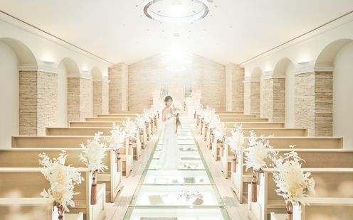 美しい銀世界をモチーフにした白壁にレンガ造りのクリスタルチャペル。スワロフスキーの輝きや、透き通るバージンロードがウェディングドレス姿の花嫁をさらに美しく魅せる幻想的な空間です。教会式・人前式・ガーデン挙式などふたりにあった挙式スタイルを提案いたします。※着席80名まで