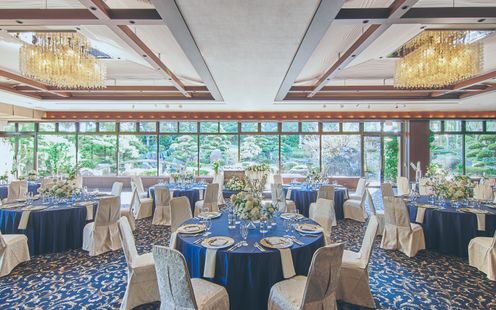 四季折々のながめが美しい和モダンな空間。ウェディングドレスも和装も映える空間なので好みの衣装をお選びいただけます。本物のシェルを使用したシャンデリアや、シーンに合わせた照明でオシャレな演出が叶います。