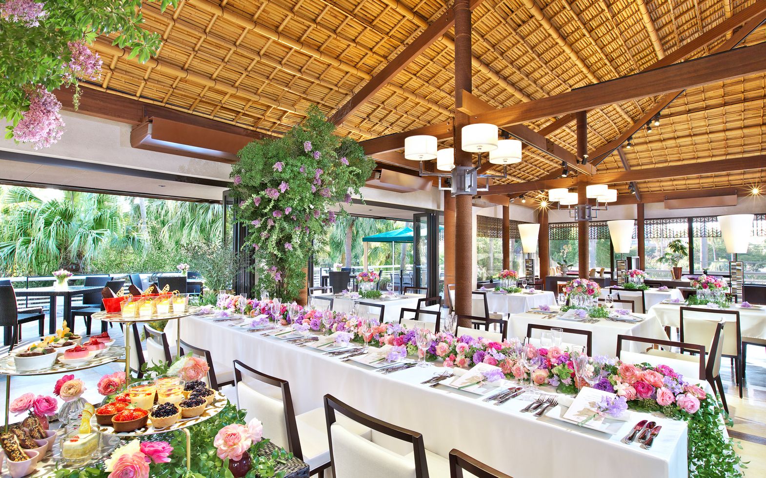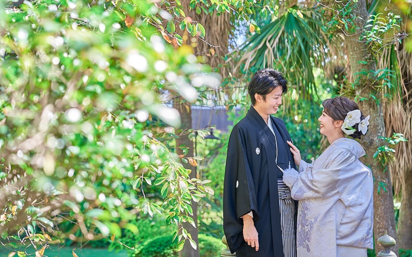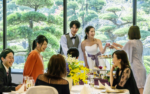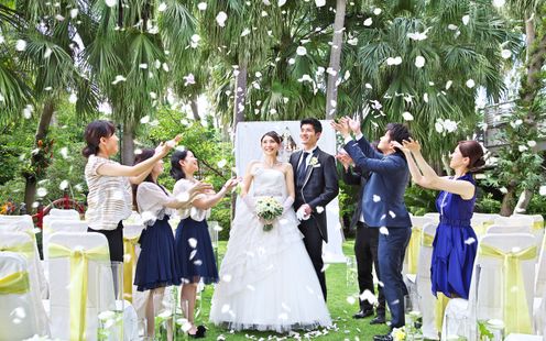 日本庭園では、伝統の和装姿で「洗心亭」での神前式を行うための「参進の儀」や人力車入場、家族との記念撮影に最適。また、パームツリーが南国ムードを演出する「スカイガーデン」ではガーデンセレモニーや、フラワーシャワー、バルーンリリースなどの開放感あふれるアフターセレモニーが叶います。ふたりのスタイルにあわせて庭園やガーデンを贅沢に独占してご利用いただけます。