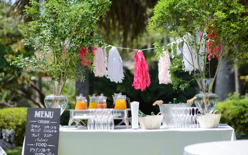 奄美の里では、「ふたりのおもてなしの心=料理のおいしさと満足感」と捉えております。「おふたりのために集まって下さったゲストにふたりのおもてなしの気持ちを表すのが料理」。厳選された素材を丁寧に時間をかけて準備をする。そんな基本を大切にした料理は、ゲストのことを考えながら準備をされるふたりの思いと同じです。両家にかわり、心をこめてお創りしています。奄美大島を代表する郷土料理の鶏飯や、お祝いの席でいただく「三献」も可能です。ふたりのおもてなしアレンジを気軽にご相談ください。