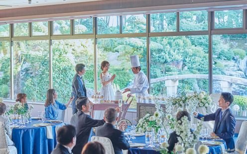オープンキッチンから出来立ての料理を楽しみながらゲストとの会話の弾むひとときを大切にしたいふたりにオススメ。テラスを使ったケーキブッフェや、バルーンリリースなどリラックスできるウェディングが叶います。