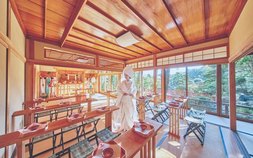 美しい庭園の中に佇む神殿は県内でも珍しい独立型。両家の家族での「参進の儀」から始まる日本の伝統ののっとった神前式。心静かに思いを込めて一歩ずつ。歩く姿さえ絵になる由緒ある屋敷で両家が結ばれる神前式を。