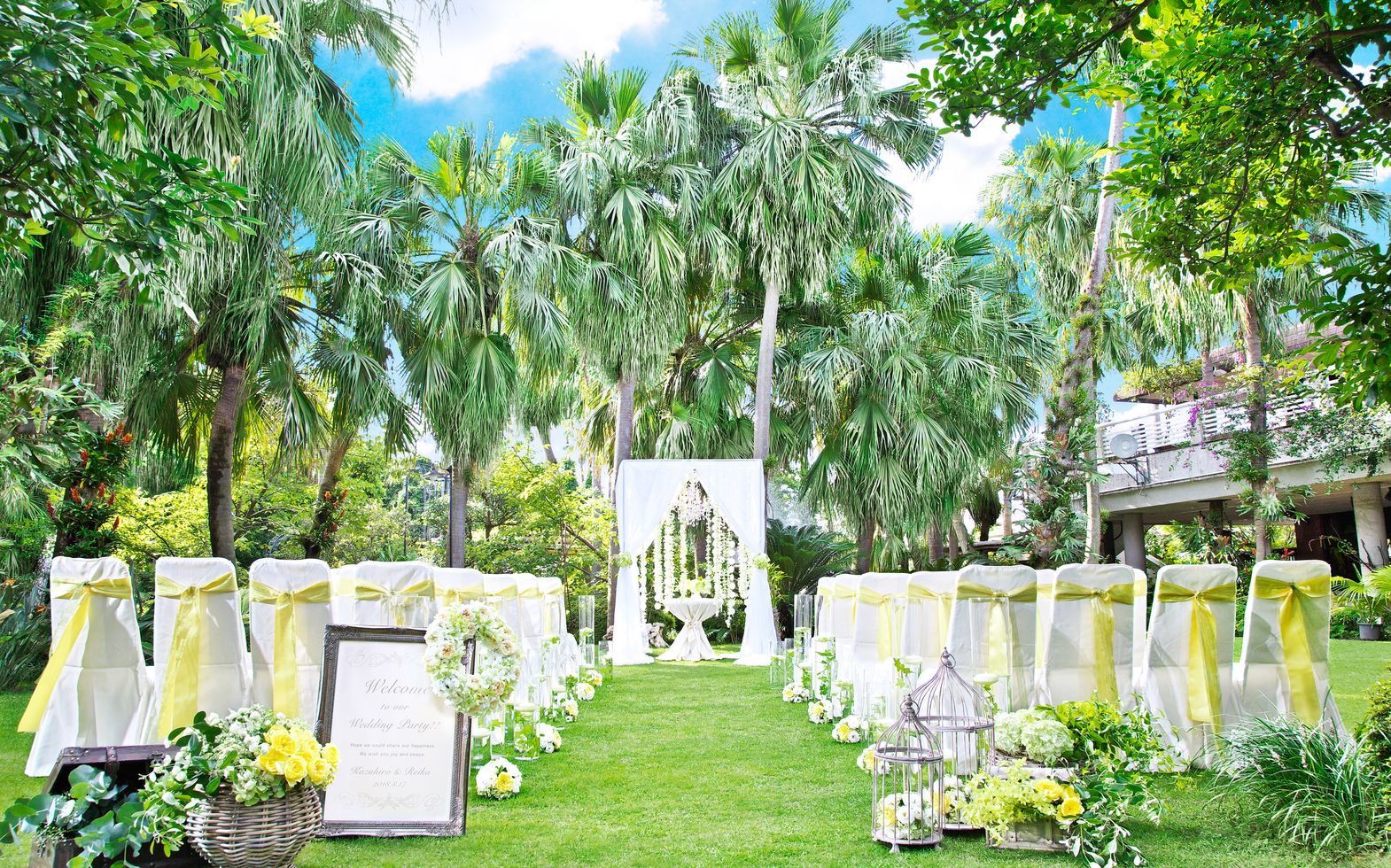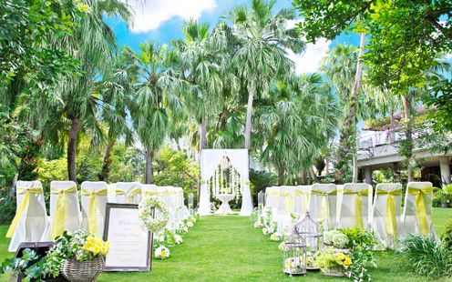 パームツリーに囲まれた南国情緒漂うガーデンチャペル。教会式とゲストへ誓う人前式が可能