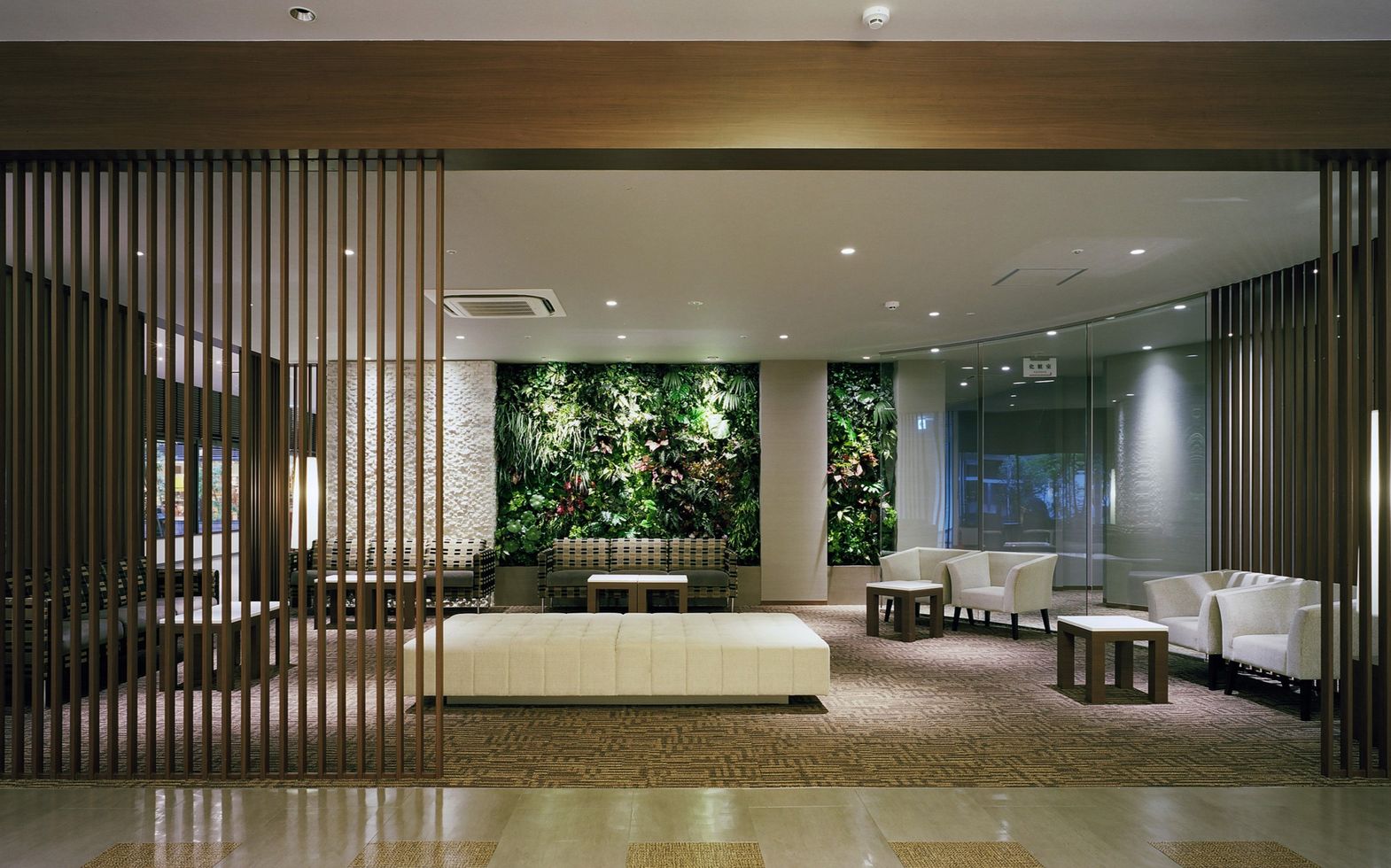 訪れたゲストにゆったりとお寛ぎいただける、グリーンウォールがアクセントになっているモダンなホワイエ。