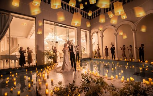 新郎新婦がそれぞれ異なる階段から入場し、ふたりが相まってからゲストの前に登場することができる造りが人気の空間《ジュワルミエール》。大きな窓からプール付きガーデンに自由に行き来のでき、ゲスト同士もリラックスした動きのあるパーティが叶うのも魅力です。さらに同会場には「プロジェクションマッピング」も備えるのでゲストとライブ感あふれる演出もお愉しみいただけます。