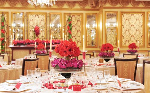 煌めくシャンデリアや壁のモチーフが優美な雰囲気を醸し出す華やか空間