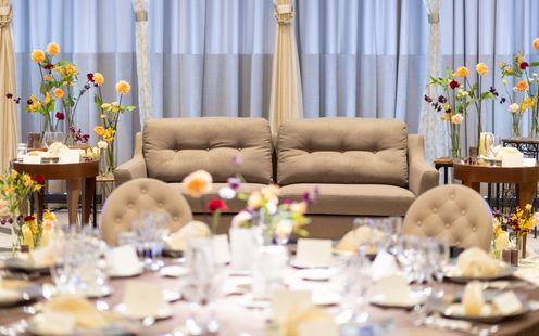 優美なアーチを描く白亜のドーム型の天井に高級感に満ちた造形美のシャンデリアが際立つ洗練空間。メイン席のおふたりを引き立てるモードなタペストリーにあわせてレトロモダン薫る大人のパーティを楽しんで。