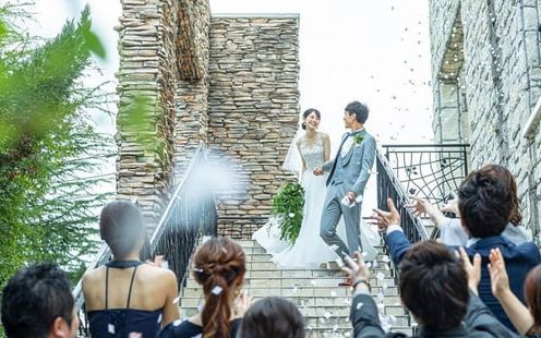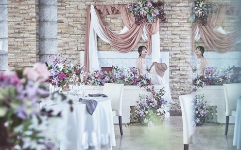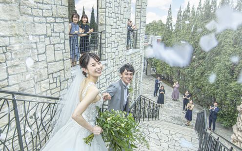 扉を開けるとそこはまるで別空間。チャペル「アクティス」は、ゲストとの距離感を大切に入退場のときのみ、自然光が差し込む神聖な空間。雰囲気を醸し出すのは大理石のヴァージンロード、モダン&シックな調度品、そしてキャンドルの灯り。県内でも珍しい落ち着いた大人な雰囲気のチャペルで神聖なセレモニーが叶います。また、挙式後は大階段に移動して爽やかな青空の下、フラワーシャワーやコンフェッティなど多彩なアフターセレモニーをお愉しみいただけます。友人はもちろん、車椅子ゲストが参加しやすい2階席があるのも魅力。また、家族の一員であるペットも参列可能ですので気軽にご相談ください。