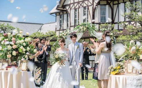 100年以上の時を重ねた迎賓館の前に広がる庭園は、美しく手入れされた芝生と緑に囲まれた気品ある空間。クラシックモダンな建築との調和が生み出す趣は、明治時代にタイムスリップしたかのような非日常を感じさせてくれます。セレモニー後にはフラワーシャワーやバルーンリリースなど、華やかな演出でゲストとの時間を心に残るものに。